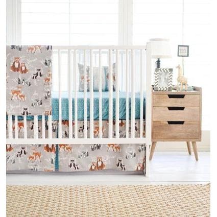 Woodland 1 to 3 piece baby boy nursery crib bedding quilt, bumper, and bed.